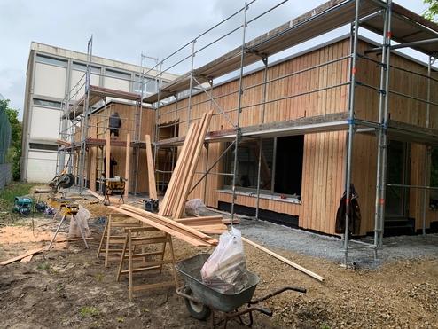Einen kleinen Betriebshof wird die Wohnbau hinter dem Gebäude zum Sportplatz an der Kirchpatthalle anlegen. Insgesamt 38 Parkplätze sollen bereitgestellt werden und die Außenanlagen – auch vor den benachbarten Häuser 30 und 32, die der Wohnbau gehören – neu gestaltet werden. Das gilt auch für die Fassaden der beiden Häuser, denn „wir wollen ein einheitliches Erscheinungsbild schaffen“, so Claus Gravemeier. Insgesamt 2,8 Millionen Euro werden von der Genossenschaft investiert.